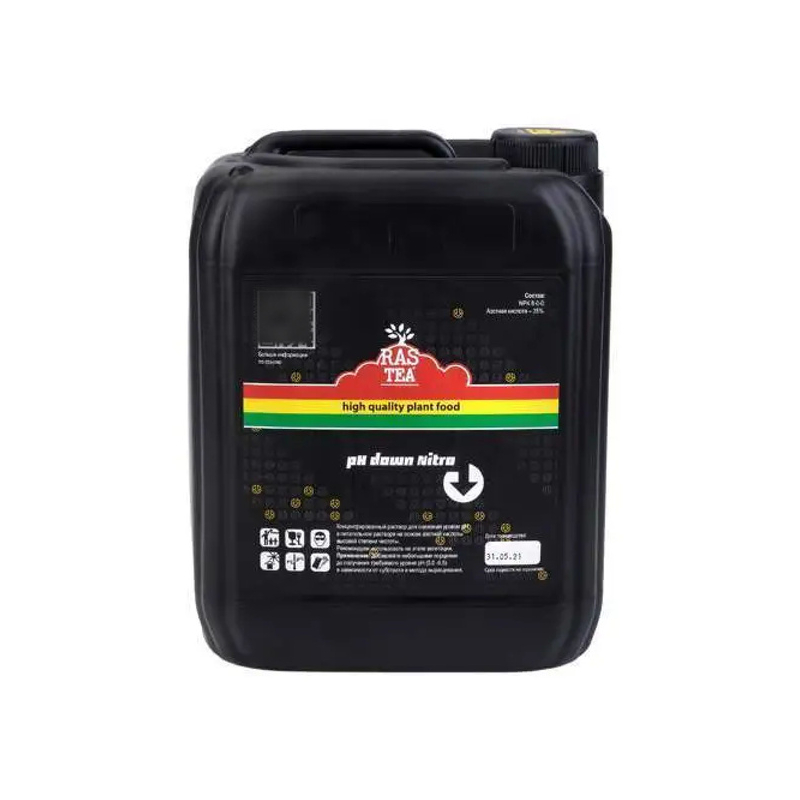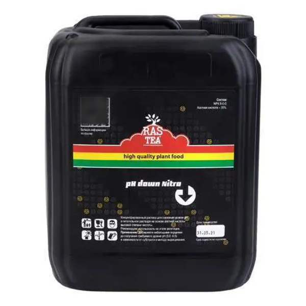 Rastea pH Down Nitro 5L концентрированный раствор для снижения уровня pH в питательном растворе. Изготовлен из азотной кислоты высокой степени очистки. Не содержит тяжелых металлов, вредных примесей и безопасен для растений в адекватных количествах. Высокая концентрация делает препарат удобным для приготовления больших объёмов питательного раствора. При добавлении в жёсткую воду, азотная кислота в результате реакции нейтрализации переводит труднорастворимые соли жёсткости в доступную растениям форму, повышая питательную ценность и препятствуя образованию “накипи” на емкостях и на капельницах.